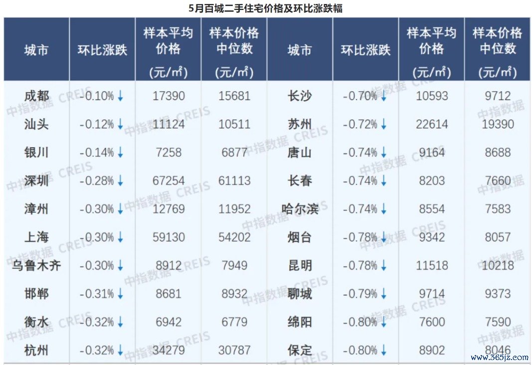 典型城市的二手房价格则出现调整。如二手房市场相对抗跌的城市包括成都、汕头、银川、深圳和漳州,5月二手住宅价格分别下跌0.10%、0.12%、0.14%、0.28%和0.30%。