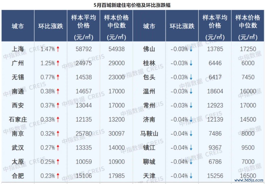具体来看,5月新房价格上涨较为显著的城市包括上海、广州、无锡和南通,环比分别上涨1.47%、1.25%、0.77%和0.38%;价格下降较为明显的城市则包括珠海、东莞、乌鲁木齐、江门和廊坊,分别环比下降1.13%、0.48%、0.41%、0.41%和0.35%。